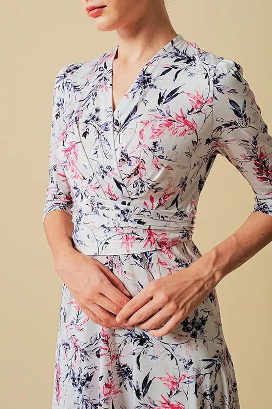 It is a versatile dress that is comfortable to wear, a beautiful silhouette, and slimming effects. I also really like the gentle lavender print.
