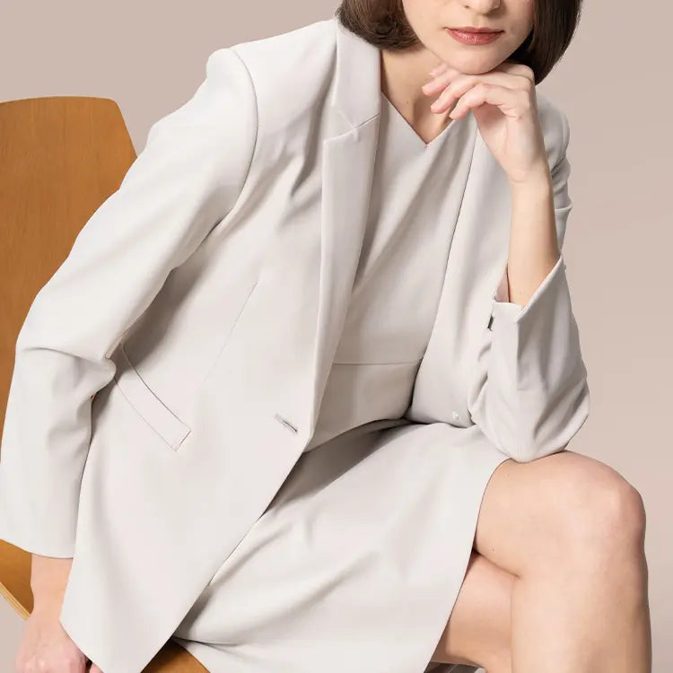This washable tailored jacket can be worn 365 days a year. Its 2-way stretch ""Smart Stretch"" fabric feels like woven fabric, yet offers just the right amount of thickness and firmness. It exudes a dashing, dignified presence, yet exudes femininity with every movement. This beautiful, flattering garment will give you confidence on your big day.