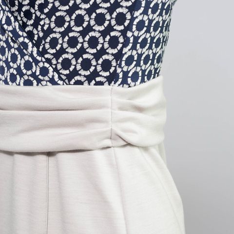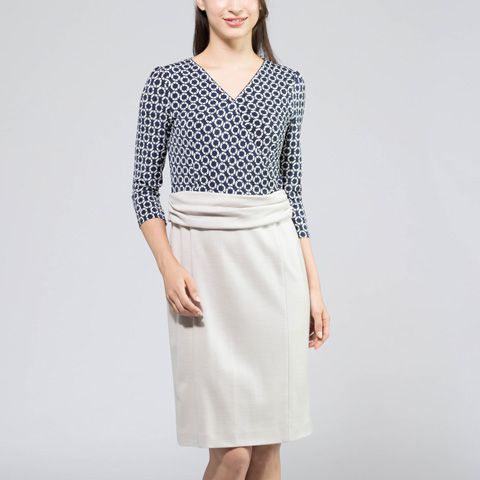 With a contrasting top and skirt, our piping dress with navy "chainon" print just made Monday mornings easy again. Look put-together in an instant, and stay warm with the 100% pure wool skirt. Pair with a matching jacket for classic office style.